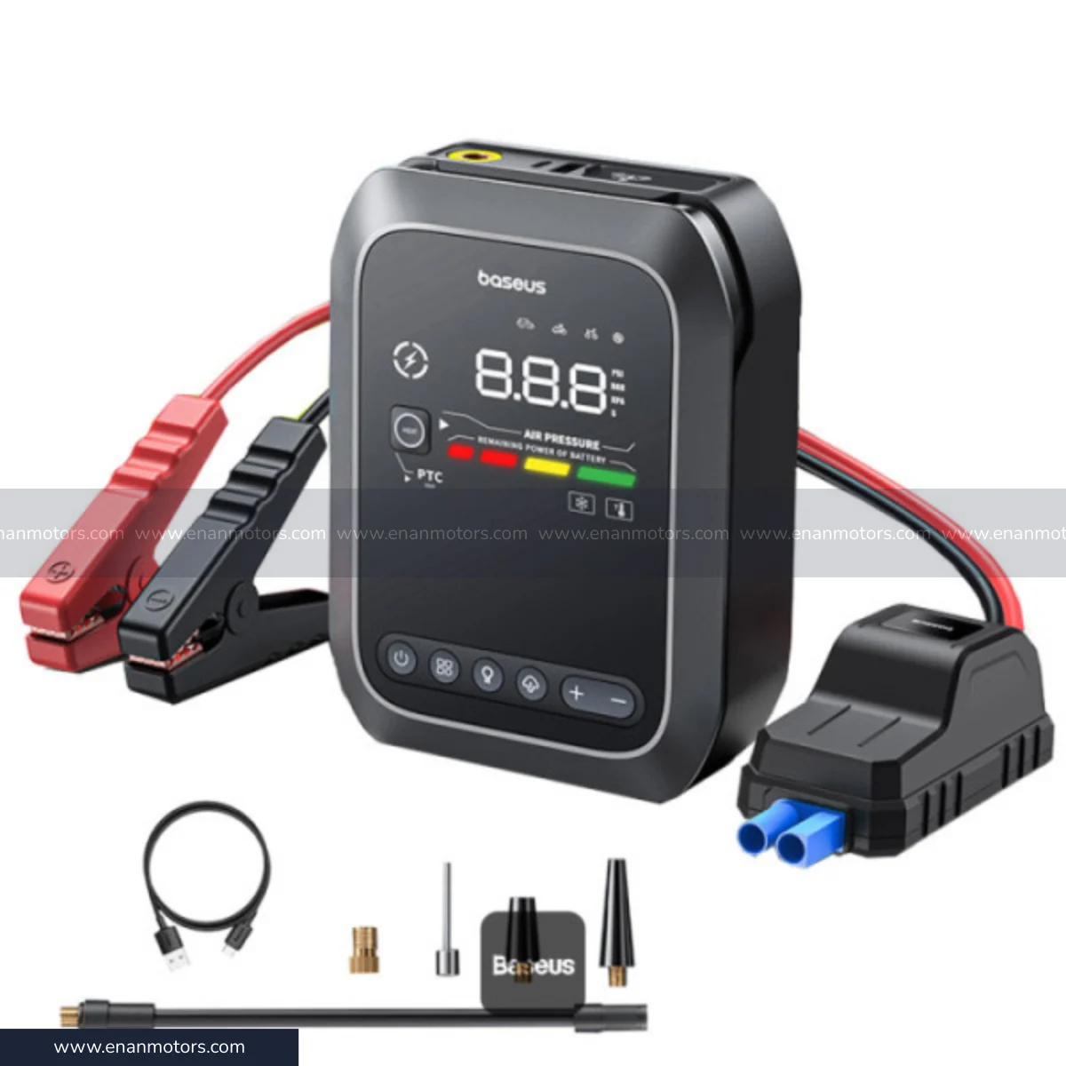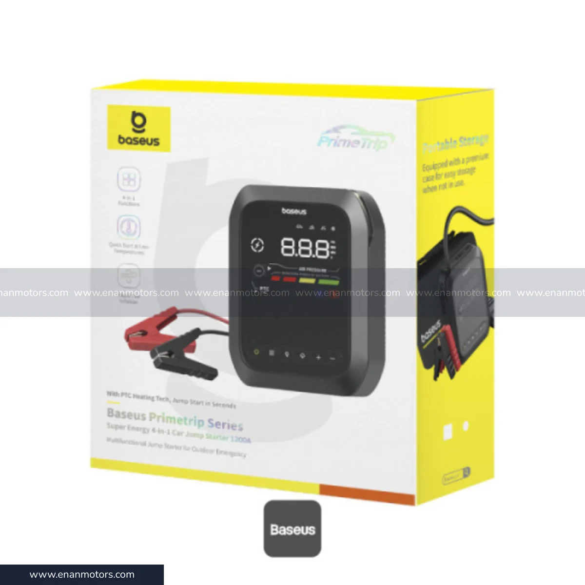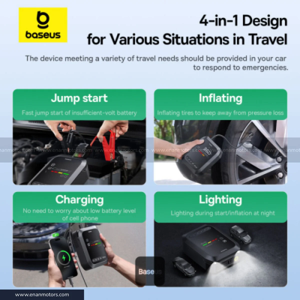 The Baseus Primetrip Series Super Energy 4-in-1 Car Jump Starter is a versatile emergency device designed to keep drivers prepared for unexpected situations on the road. Combining a jump starter, tire inflator, portable power bank, and flashlight, this compact tool provides multiple essential functions in one convenient unit.